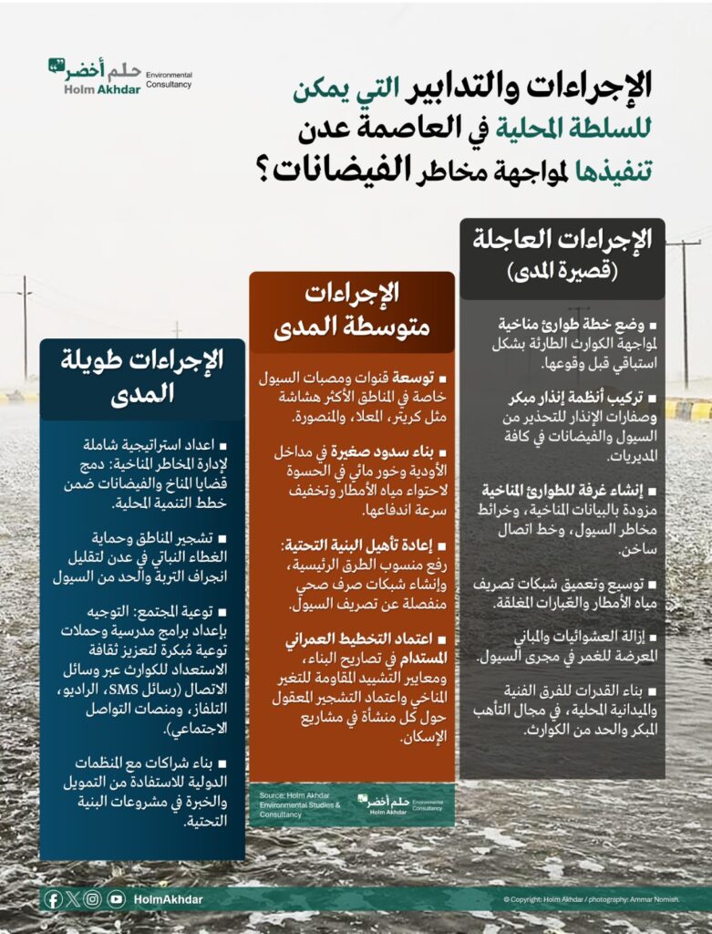 وفي هذا السياق، يدعو حلم أخضر للدراسات والاستشارات البيئية، سلطات العاصمة عدن، ممثلة بوزير الدولة، محافظ المحافظة، معالي الأستاذ أحمد لملس، إلى ضرورة اتخاذ قرارات مستنيرة بشأن التصدي لتأثيرات التغيرات المناخية، واتباع نهج التكيف والمرونة المناخية، وإدارة الكوارث بشكل فعال.
