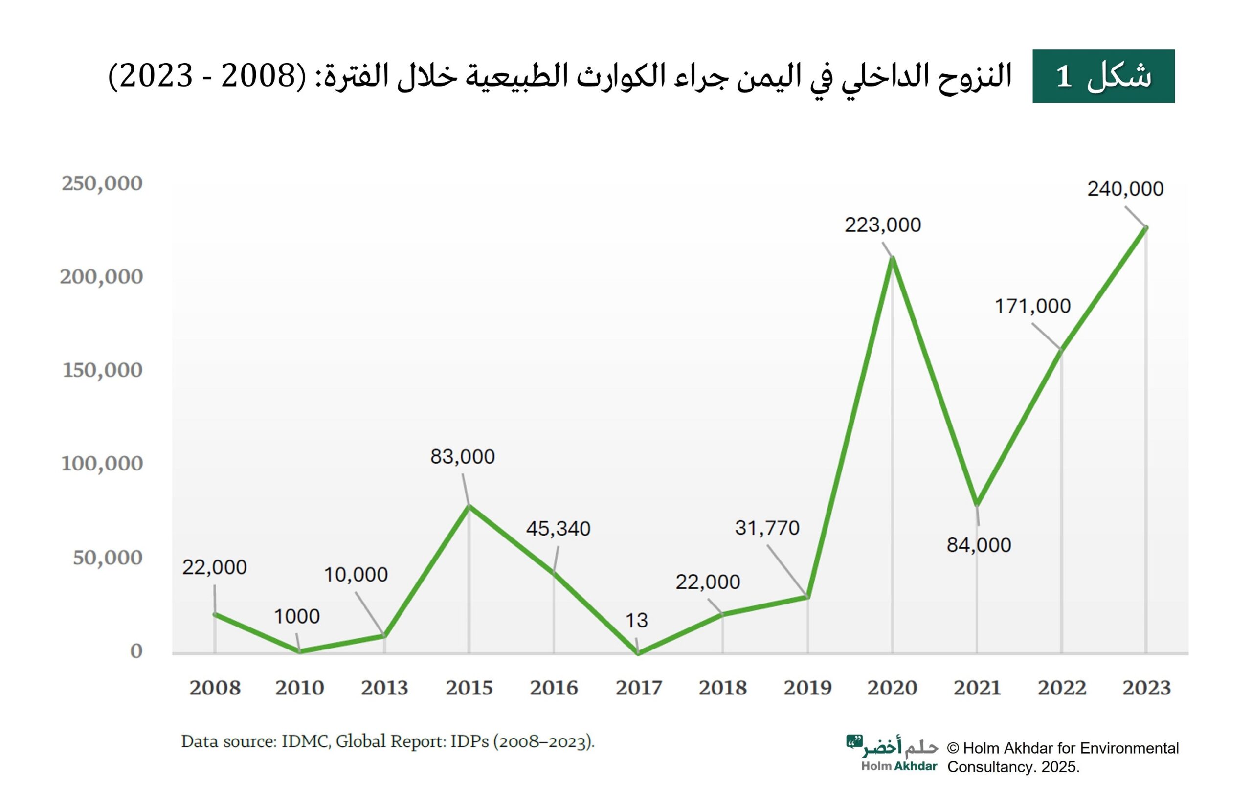 تتمثل إحدى العواقب الوخيمة لكوارث المناخ في اليمن، في النزوح المتكرر لسكانه.[1] فعلى مدى عقد ونصف خلال الفترة الممتدة بين (2008-2023) تسببت الكوارث الطبيعية في البلاد في نزوح حوالي 933,000 شخص.[2] وأظهرت البيانات أن قرابة 85% منهم نزحوا بسبب السيول والفيضانات. وعلى الرغم من تراجع النزوح المرتبط بالصراع في اليمن منذ اعلان اتفاقية الهدنة من قبل مكتب المبعوث الأممي الخاص إلى اليمن، ووقف اطلاق النار بين اطراف الصراع في أبريل 2022، إلا أن حركة النزوح المرتبطة بالمناخ زادت بنسبة كبيرة في العامين 2022-2023. (انظر شكل 1)