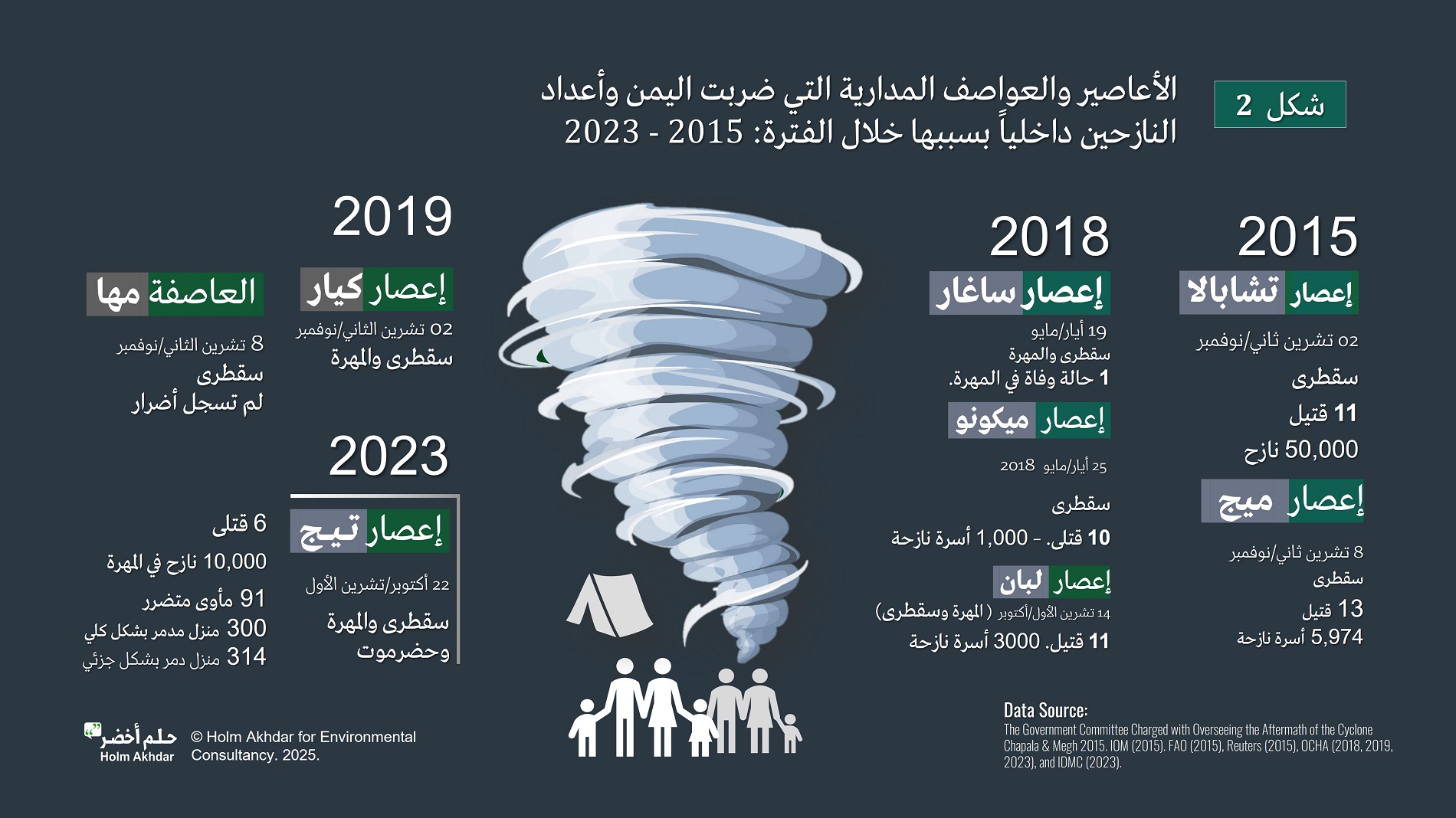 تشير البيانات المرصودة في شكل (2) أن أعداد النازحين الداخليين جراء الأعاصير والعواصف في اليمن بلغ 69.975 شخصاً خلال الفترة (2015-2023). ومع ذلك، قد يكون العدد الاجمالي أعلى من ذلك بكثير، حيث وجدت العديد من مواقع النازحين المتضررة من الكوارث المرتبطة بالمناخ، والتي لم يجري تقييمها بسبب محدودية الوصول للجهات الفاعلة. وفي الواقع، إذا قمنا بحساب النازحين من الأعاصير والعواصف في كافة المحافظات المتأثرة خلال الفترة ذاتها، فقد يتضاعف الرقم. حيث يشكل الافتقار إلى المعلومات والبيانات الميدانية الدقيقة، وسجلات الضحايا جراء الكوارث الطبيعية في اليمن، تحديًا كبيرًا في أبحاث النزوح المناخي.